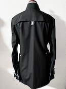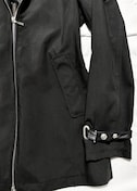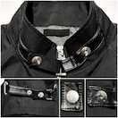 襟や袖口のベルト その他所々に羊革ラムレザーで装飾された上品で高級感のあるコートジャケット