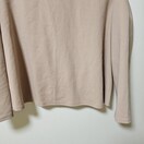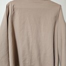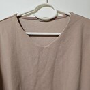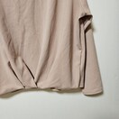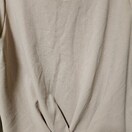 柔らかい生地のベージュVネック長袖トップス、ウエスト部分がねじれたデザイン。