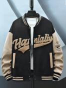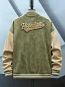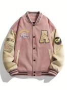 メンズ ヴィンテージ ストリートウェア バーシティジャケット マルチカラーロゴパッチ付き (A//77/チーム/名前) - ピンク&カラーブロック, ルーズフィット ベースボールカラーコート, スナップボタン, 洗濯機対応 カジュアルスピリットアウトフィット用ジャケット