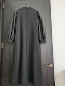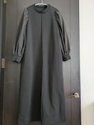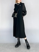 身頃はしっかりとした地厚で、程よく伸縮性のあるダンボール生地を使用し、袖には布帛生地をドッキングしたデザインワンピースです。