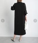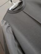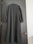身頃はしっかりとした地厚で、程よく伸縮性のあるダンボール生地を使用し、袖には布帛生地をドッキングしたデザインワンピースです。