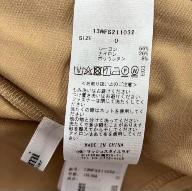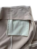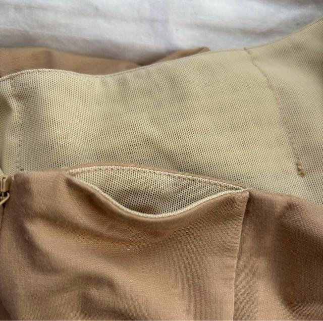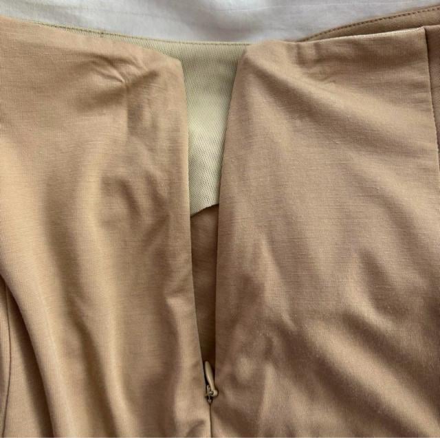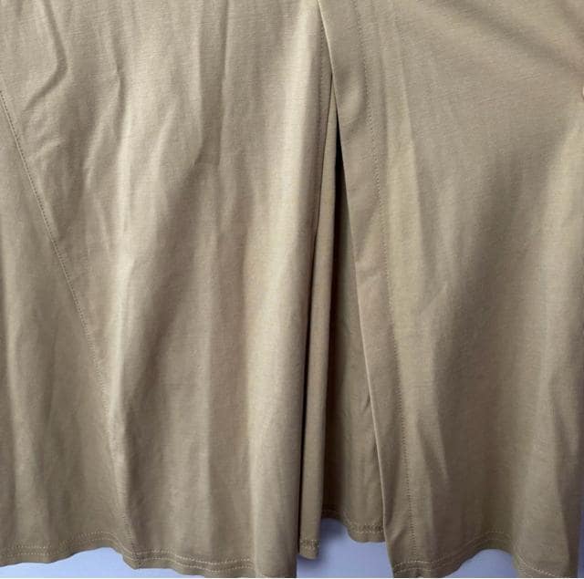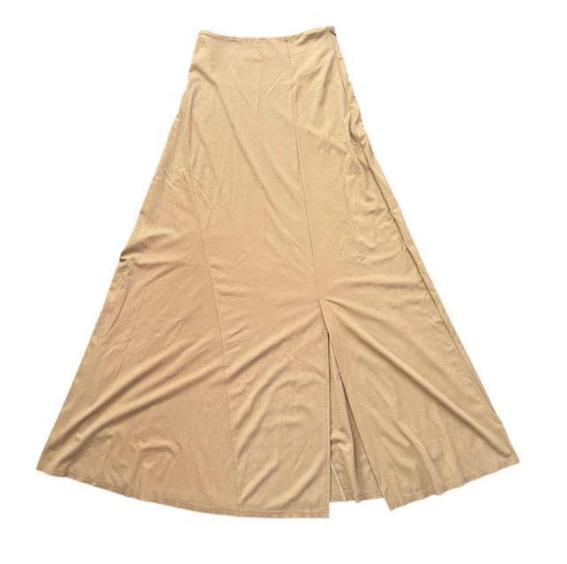 伸縮性のある肌触りの良い上質な素材。ベージュのフレアスカート、スリット入りデザインです
