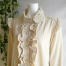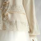 肩とフロントのフリルや上品なきらめきのパール調ボタンがクラシカルな印象。