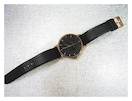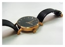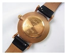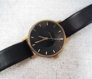 文字盤はブラック(黒)です。ケースと裏蓋はゴールドまたはローズゴールド(銅色/ブロンズ)系の色味です。ベルトはブラックレザーです。