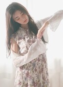【ふんわりプリーツプリントワンピースにレースアップデザインとフリルデザインをのせて】