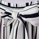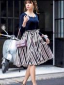 スタイリッシュなストライプ柄で、洗練された大人の雰囲気を醸し出す膝丈スカート。風揺らぐアシンメトリーなヘムラインが、より女性らしさを誘うディティールです。メリハリのあるシルエットへと導く、ウエストにあしらったリボンベルトも魅力。