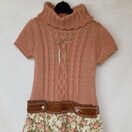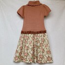 ピンクベージュの半袖、キャプスリーブ ハイネックニットとフラワープリントの切替 ドッキング ワンピース。