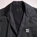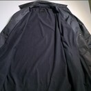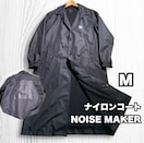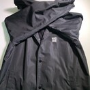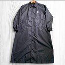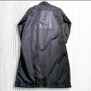 ナイロン素材のMサイズステンカラーコート、背面にロゴプリントあり。