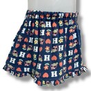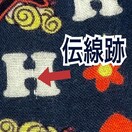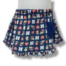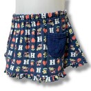お花やハート,Hのアルファベットの中にミニちゃんフェイスが散りばめられたどこかレトロな雰囲気の総柄プリントにフロントの左腰にはダンガリーデニムのポケット付