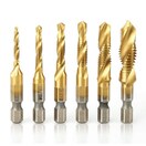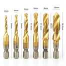 材質:HSS 6角軸ドリルタップ 。サイズ:M3 x0.5 、M4 x0.7 、M5 x0.8 、M6 x1.0 、M8 x1.25 、M10 x1.5。軸:1/4"(6.35mm)