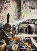 廃屋内の静物画を描いたわけですが、面白いことに気付きました。整然と並べ、構成を考えて描く静物画は、だいたいの場合、瓶等は、上方・下方・斜め等から見て描くにしても、置いてある瓶は垂直に配置します。が、この廃屋にある瓶は、瓶下が傷んでいて微妙に斜めだったのですが、そのまま描いてみました。するとどうでしょう、マジで描きにくいったらありゃしない。大きくズレて斜めに傾いているとかだったら問題ないのですが、本当に微妙な傾きは形を取るのが難しいです。更に、実は瓶の前にある黄土色の皿、割れていて、そこの間に瓶が少し入った感じで、ほぼ、同じくらいの位置にあって(と言っても碗は円形ですから縁の部分はこちらに近い)、不自然に見えてもそうなっているから仕方がない。蜘蛛の巣だらけでも廃墟や廃屋が好きな方には良いのではないか? と。私も綺麗に咲く花とかあまり描く意欲がわかず、結局、アングラ的絵画になってしまうので、廃墟・廃屋マニアまではいきませんが、どうしてもメジャーな絵を描く気にはなれないのです。尚、8枚目9枚目の写真は電気を点けない、日差しが殆ど当たらない場所での撮影で、実際の風景はこちらの方が近いです。
