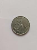1994年のベルギーの5フラン黄銅硬貨です、直径約24ミリ、アルベール2世の図柄、1枚限りです。締切日時