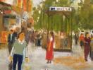 御堂筋沿いの地下鉄の出入口あたり、難波-西道頓堀の並木のある街景を描いた作品である。車道は南行き一方通行だが、この辺りは大阪万博(EXPO2025)にあわせて歩道が幅広く区画整理された地域だ。整備された並木の初夏。街頭の風景を表現主義的に明快な筆致で描きました。(金山ヒロシ)