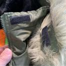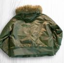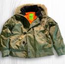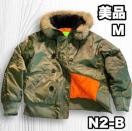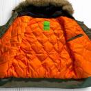 オリーブグリーンのN2-Bフライトジャケット、オレンジの内側とファー付きフードが特徴。