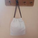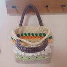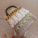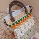 ★アクリル毛糸で編んだ、オフホワイトのうさぎさんが並んだ、可愛らしい巾着付きバッグです。