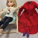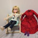 リカちゃん本体、イヤリング付、着用のアウトフィット、赤いドレス、靴2足、椅子をお付けしました。
