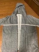 INGNIのMサイズ、グレーのフード付きカーディガン、ポリエステルと綿の混紡素材で快適な着心地。