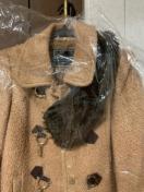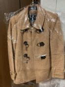 ベージュの毛混合ダッフルコート、ファー付き襟と金具ボタンでスタイリッシュ。