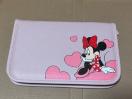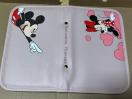 収納ポーチは合皮素材にシボ加工がされていて、前後にミッキーとミニーのイラスト、背面にブランドロゴがプリントされています。