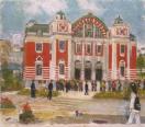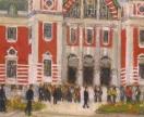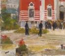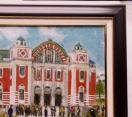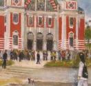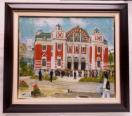 中之島公園の大阪市中央公会堂(通称 中之島公会堂)を描いた作品である。ネオ・ルネッサンス様式の公会堂は1918年(大正7年)竣工の歴史的建造物で国の重要文化財にも指定されている。当時、”北浜の風雲児”と呼ばれた株相場師の岩本栄之助からの莫大な個人寄付金でもってこの公会堂は建てられたのであるが、設計には東京駅の辰野金吾が加わっている。なんの会合だろうか玄関前の広場に集ってくる若者たち。大都会の空に映える化粧赤レンガの近代建築。表現主義的に明快に、質感のある筆致で描きました。(金山ヒロシ)
