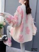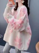 レディース オーバーサイズ Hライン ミドル丈セーター - ピンク&ホワイト ハート&リボン柄、かわいい冬用セーターコート風プルオーバー、ソフトなラウンドネック 長袖ブラウス カジュアル&オフィスウェア用(ウエストタイベルトなし)
