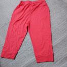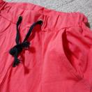 カジュアルなオレンジピンクの七分丈パンツ、ゴムウエストとドローストリング付きで快適な着用感。