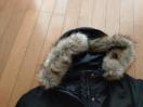 フード取り外し不可ファー部分可能、前はファスナーとボタン、ポケットあり