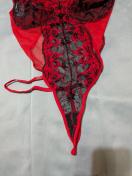 鮮やかなレースの赤と黒のセクシーなボディースーツになります