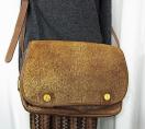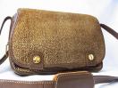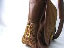 【色味】 本体の羊革は、光沢のあるゴールド(キャメル)とブラウンのコンビネーションです。ショルダーストラップやトリミング部分は落ち着いたブラウンです。