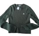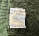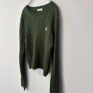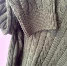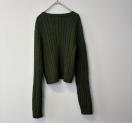 ダークグリーンのケーブルニット、長袖、クルーネックデザイン。