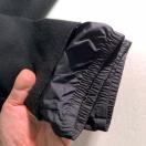 フード付きのブラックドライバーズニット、異素材切り替えデザイン。