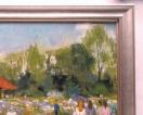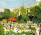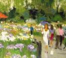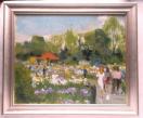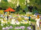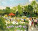 城北(しろきた)公園の花菖蒲園を描いた作品である。この菖蒲園は朱色の屋根のあずまやを中心にした設計で回遊式庭園形をとり、そこには約250種13,000株の花菖蒲が栽培されている。5月下旬から6月中旬が見ごろ。花菖蒲には、約250品種、約1万3000株があって、それぞれに改良が加えられ多品種に分かれている。庭園を囲む初夏の樹林。競って咲き乱れる花菖蒲。園内を回遊する花見客。日本庭園の花のある初夏の情景を表現主義的に堅牢な色調で描きました。 (金山ヒロシ)