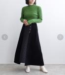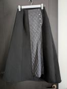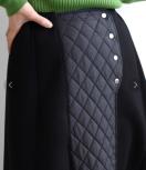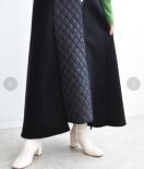 フロント部分をキルティング生地で切り替えたダンボールニットスカート。程良いフレア感のシルエットとパネル切替が、カジュアルながら大人らしい印象に。ウエストはすっきりさせながらも総ゴム仕様なので、ラクに着て頂けます。