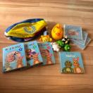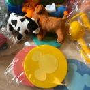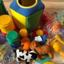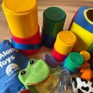 - セット内容: カラフルな積み重ねカップ、フェルト製のカエル、牛、犬のぬいぐるみ、ボール、その他の知育玩具