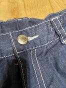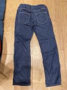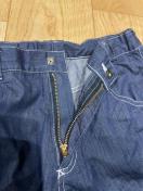 ダークブルーのストレートレッグデザイン、金属製ファスナーとボタン付きの長ズボンです。