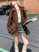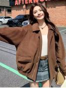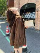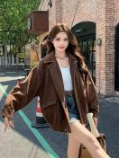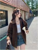 レディースコーデュロイジャケット ブラウン - オーバーサイズHライン リラックスフィット ショートウエストカラー ジッパーフロントコート、オールシーズンカジュアルアウターウェア ポケット付き、プチサイズ向けコーデュロイコート (洗濯機可)