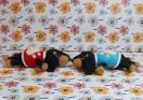 ハート模様肉球の服を着た羊毛フェルトのダックスフントの2匹セット。