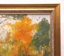 秋楡が茂り紅葉した久宝寺緑地の秋日を描いた作品である。金剛生駒山系のふもと八尾市、東大阪市、大阪市の三市にまたがり、河内野の一角にあるこの緑地公園は服部大泉、鶴見と共に大阪府の四大緑地公園の一つ。甲子園球場の10倍の広さといわれている。そして、そこにはスポ−ツ施設の他に樹林帯、さらに芝広場、花広場などが点在してあり。市民の憩いの場となっている。秋色に染まりいく 秋にれ。散策する人物点景。秋日の公園の風情を表現主義的に質感のある筆致で描きました。 (金山ヒロシ)