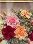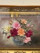 リボンで刺繍された3D絵画、花瓶に入ったバラの花束です。