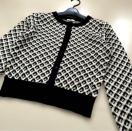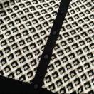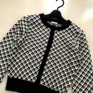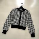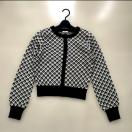 ミニダイヤ柄のニットカーディガン、リブ編みの襟と裾が特徴。