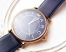 マークジェイコブスの人気モデル「ROXY(ロキシー)」シリーズより、ブランドネーム「MARC」を12時〜3時位置に配したシグネチャーデザインの腕時計。スリムな丸型ケースにバーインデックスとインナーサークルのダブルインデックスがクラシカルな印象を与え、ネイビー×ゴールドの配色が上品な1本です。女性がメンズチックにやや大きめの時計をつける感じで大人可愛いです