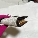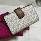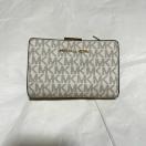 MKのモノグラム柄が上品な二つ折り財布。大きめの小銭入れに豊富なカードスロットで収納力◎飽きのこないでデザインは長く愛用頂けるアイテムです。