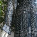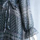 フリル襟と花幾何学柄が優雅な上質プリーツワンピースです。