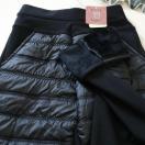 前身の中綿入り光沢生地と後身のストレッチ生地とのダウンパンツ風異素材切替パンツです。