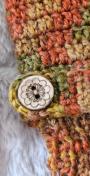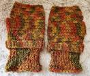 茶色系等々グラデーション(ウール&アクリル)毛糸で編んだハンドウーマに毛糸で編んだバンドに可愛いボタンを付けました。