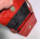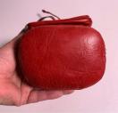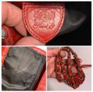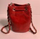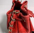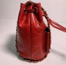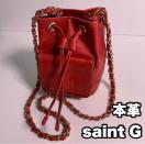 本革製の赤い巾着型ショルダーバッグ、ナイロン内装。斜め掛け可能