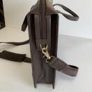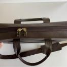 シボ革製のブラウンビジネスバッグ、ショルダーストラップ付きで機能的。