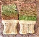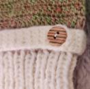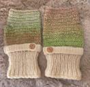 黄緑、薄ピンク系のグラデーション毛糸で編んだハンドウォーマに白色モヘア毛糸で編んだバンドに可愛ボタンを付けました。