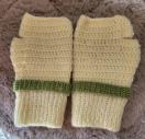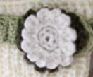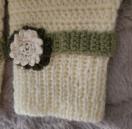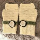 薄緑色の毛糸でバンドを編み白色と濃緑色で可愛いお花を編み付け、袖口はゴム編みです。