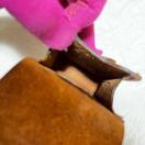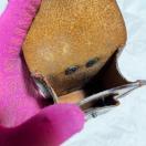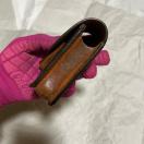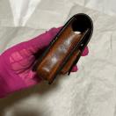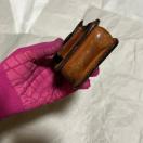 長年にわたり使い込まれ、深い飴色へと育ったヴィンテージレザーの小物入れです。画像からも伝わる通り、フラップや本体に刻まれたキズや色の濃淡が、このアイテムが辿ってきた歴史を物語ります。